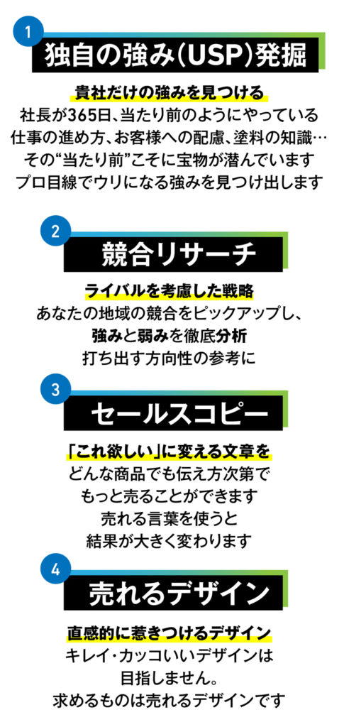 100社以上の実績の中で、強みがなかった会社は一社もありません。社長が「当たり前」だと思っている仕事へのこだわり、お客様への配慮など、その全てが他社にはない最高の宝物です